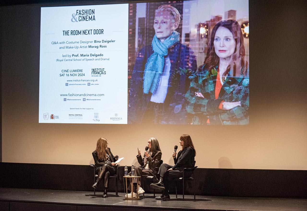 Maria Delgado hosting a conversation with make up designer and artist Morag Ross and costume designer Bina Daigeler at a special screening of Pedro Almodóvar’s The Room Next Door at the Cine Lumière, London, 2024.